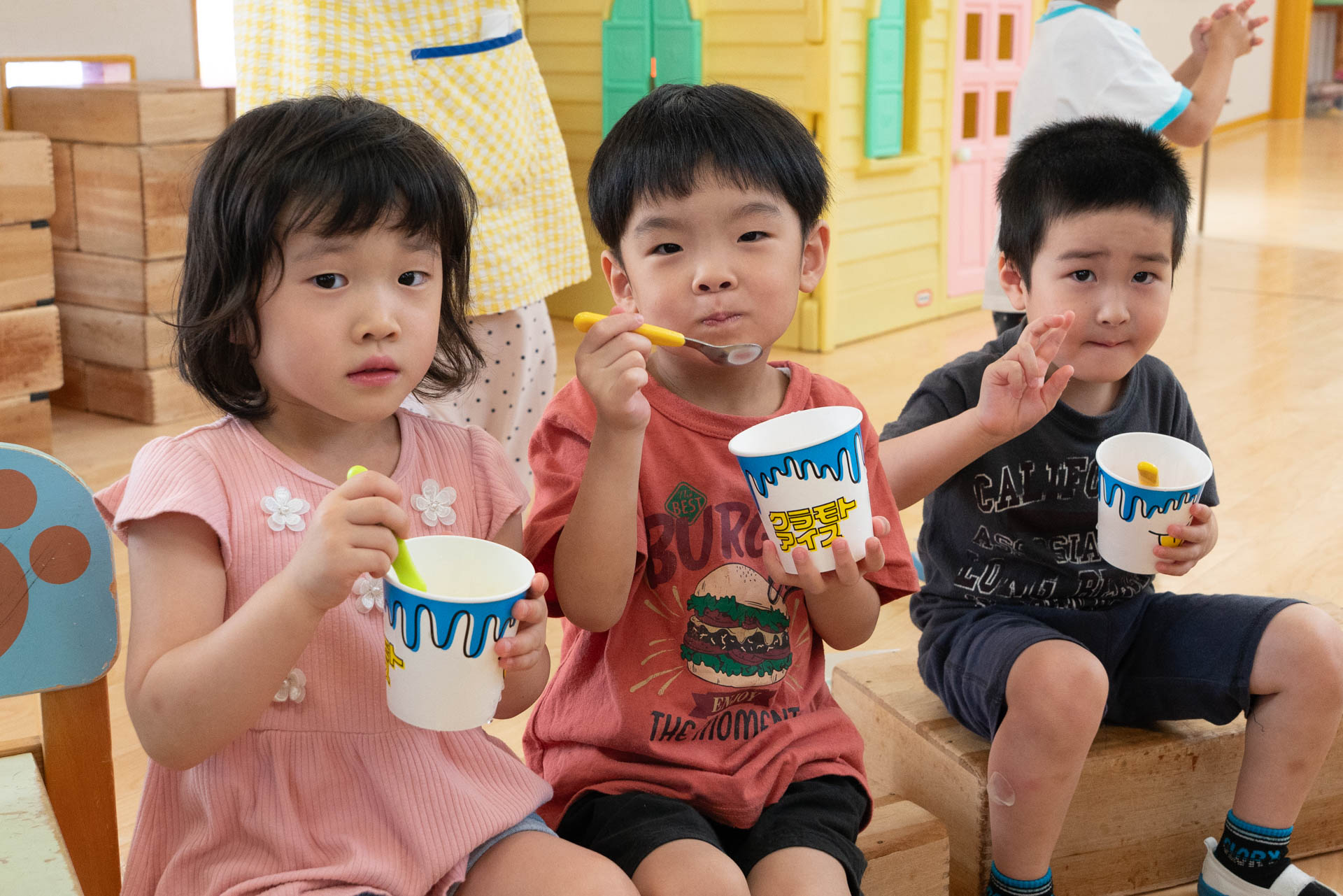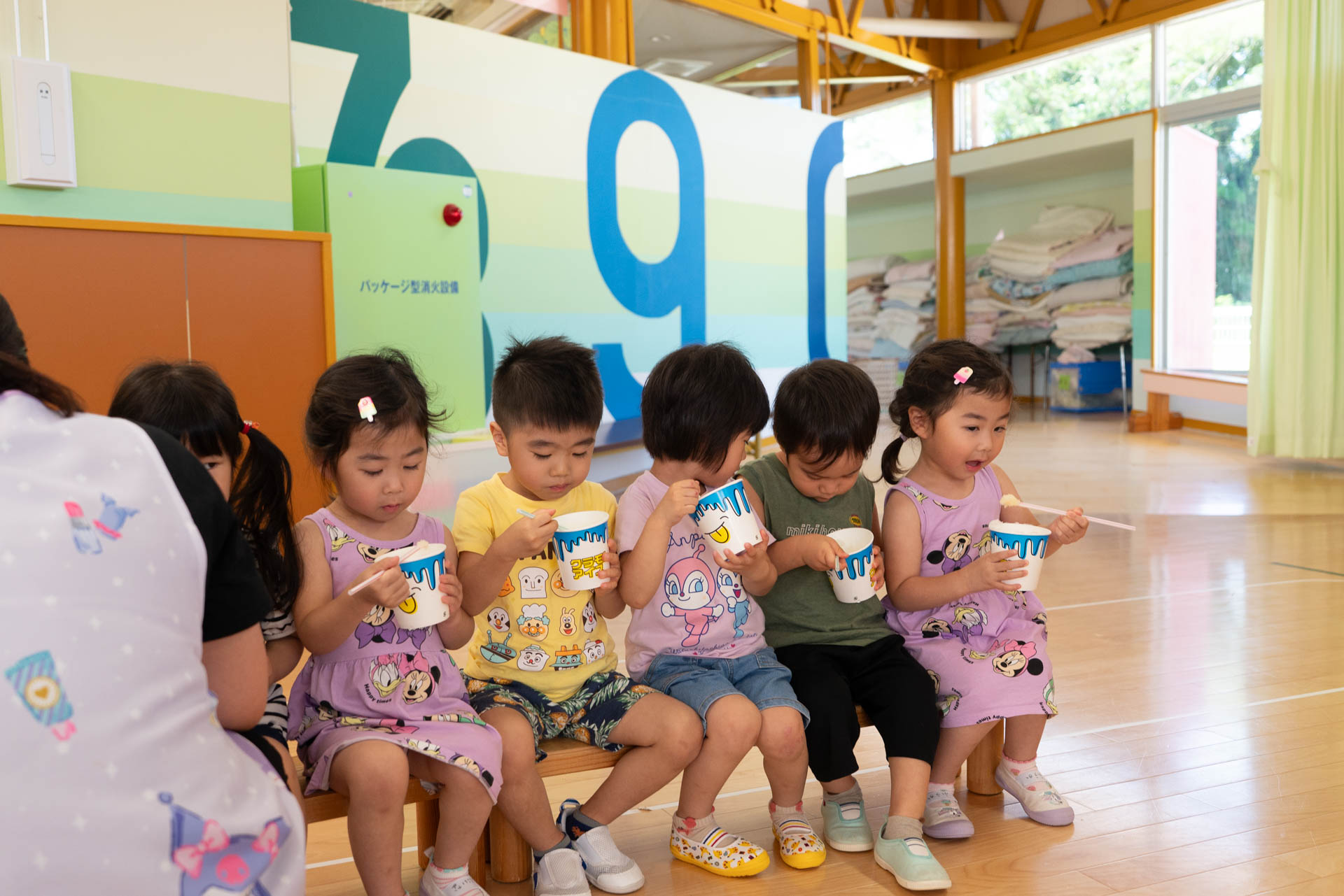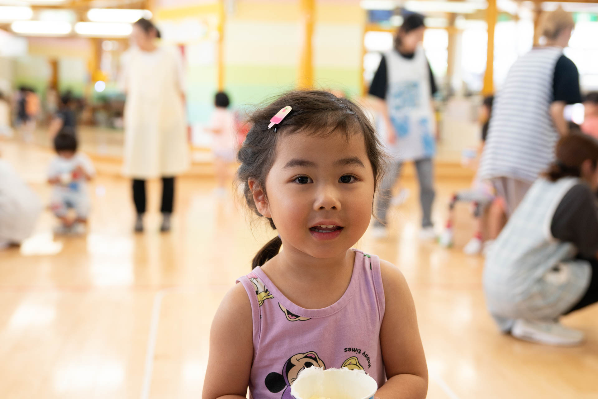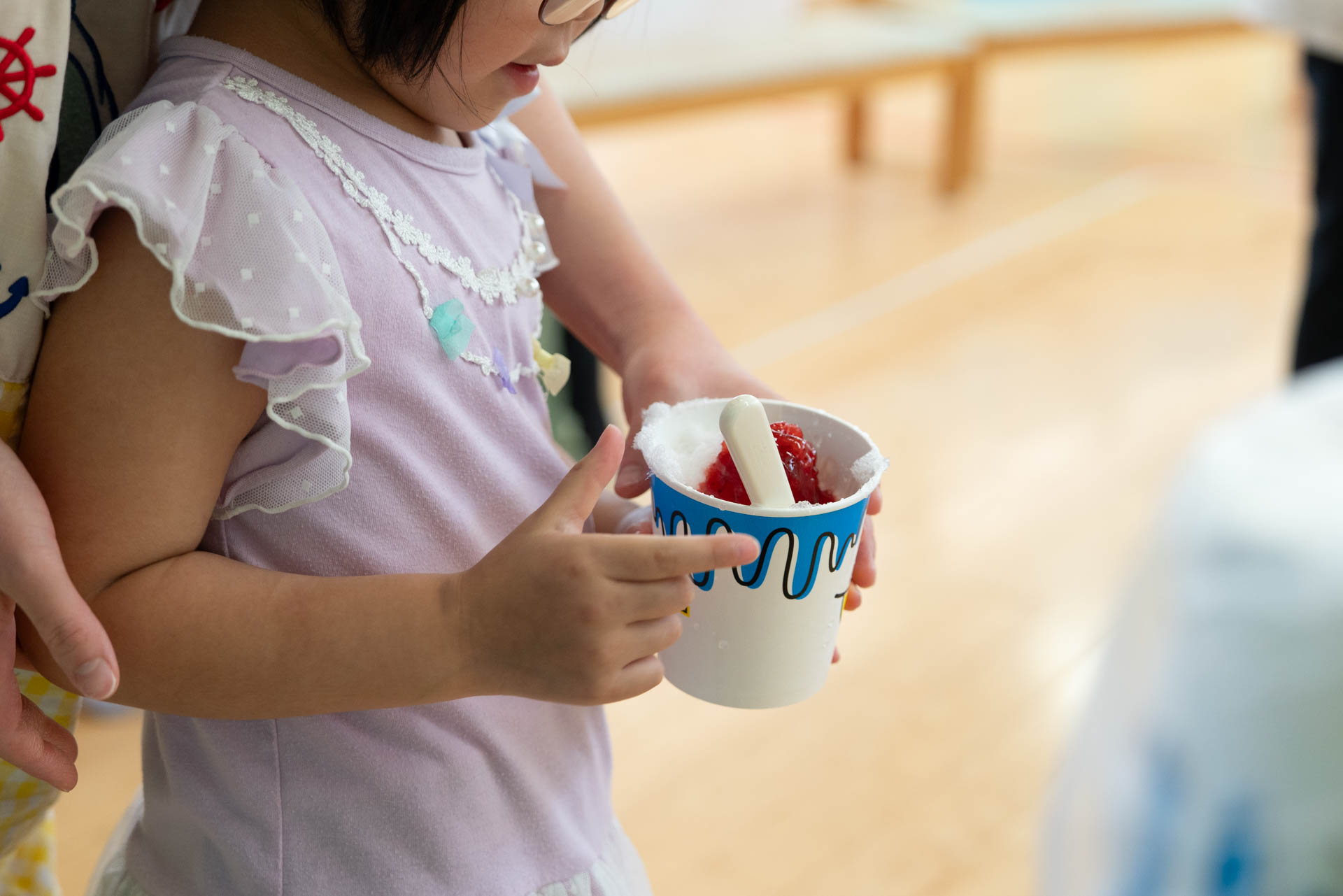 その後も浜崎あゆみだったりと、実はかき氷を削りながらも耳は完全そっちに持ってかれました…楽しい音楽とともに、先生も児童も楽しんでくれています。まずは未満児さんからかき氷をふるまい、順番に年少さん、年中さんと上がっていきます。