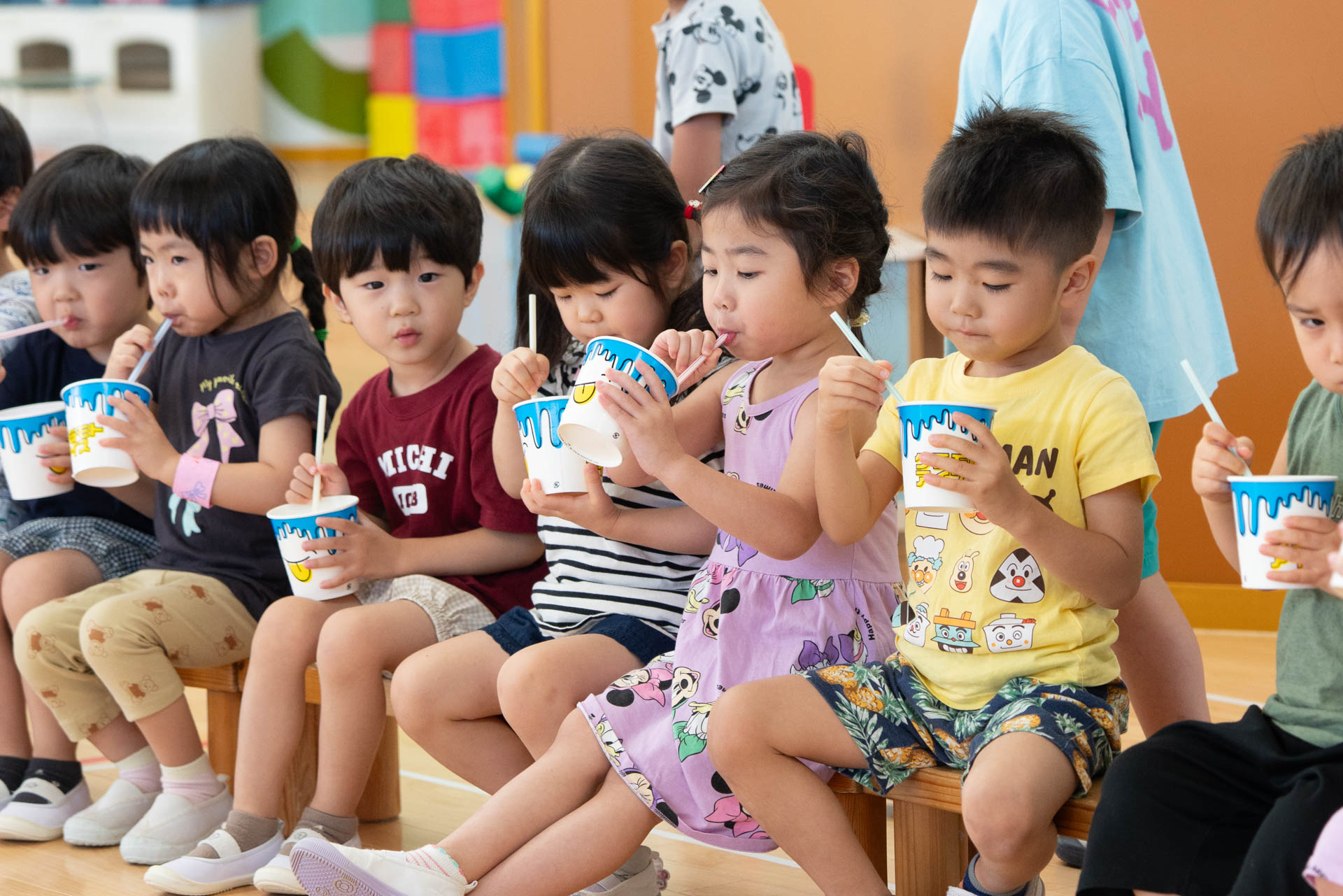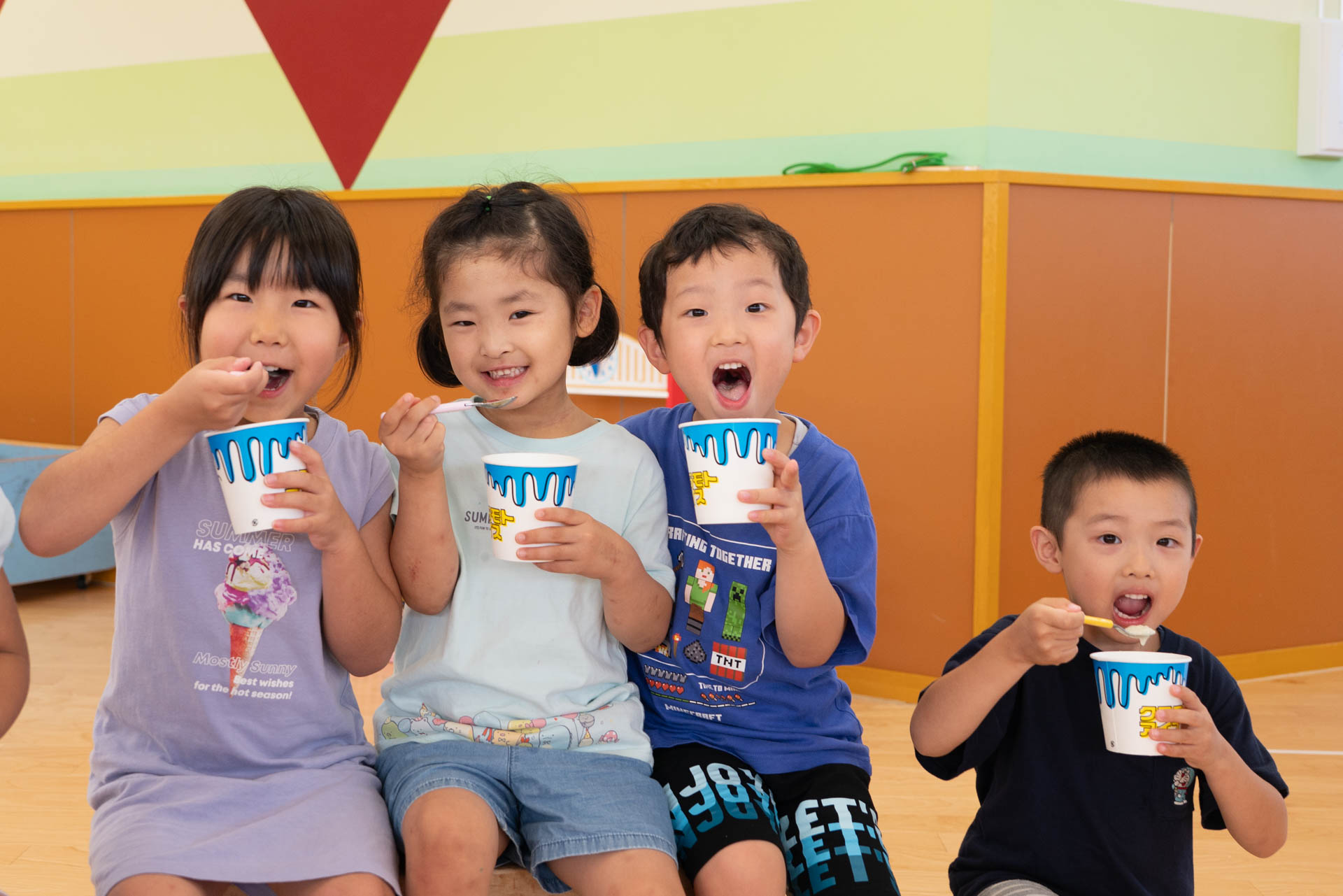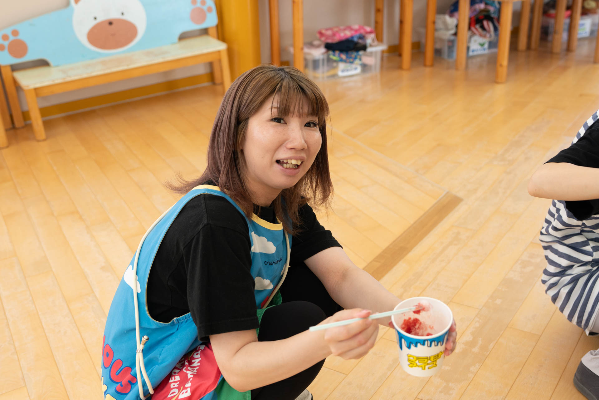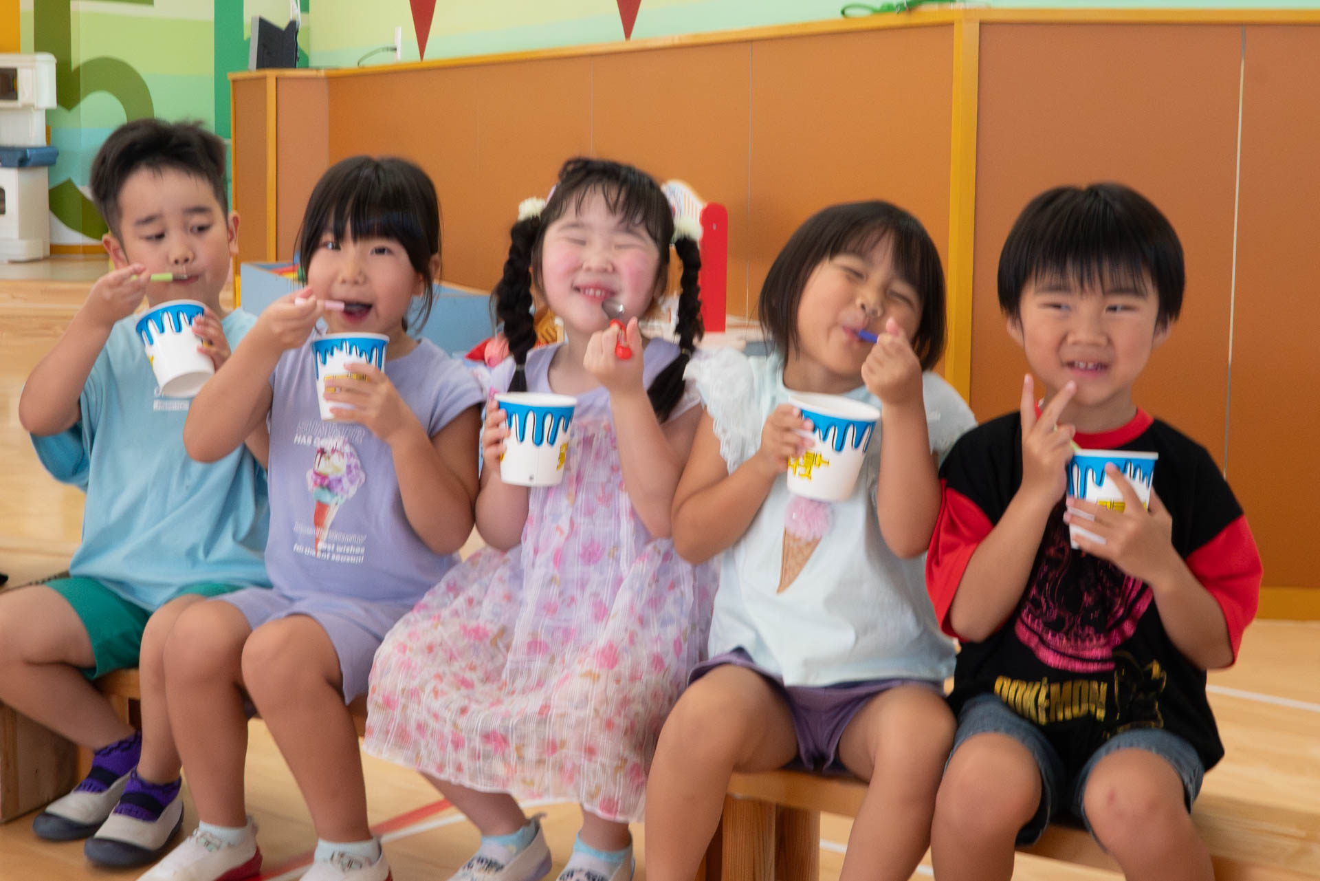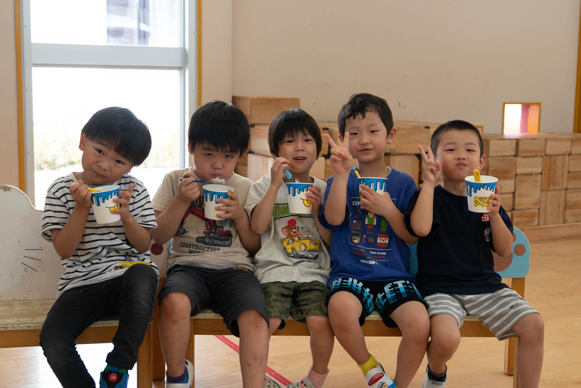 その後も浜崎あゆみだったりと、実はかき氷を削りながらも耳は完全そっちに持ってかれました…楽しい音楽とともに、先生も児童も楽しんでくれています。まずは未満児さんからかき氷をふるまい、順番に年少さん、年中さんと上がっていきます。