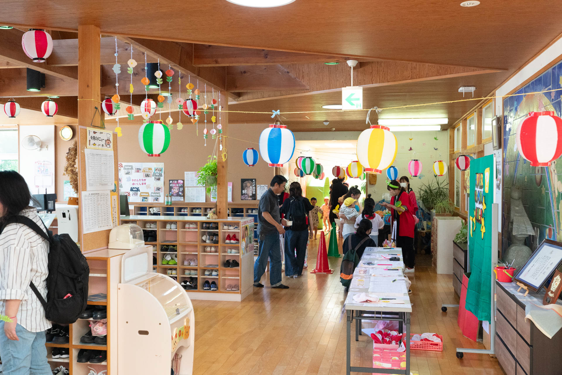 玄関に入るなりまず驚いたのが自作のポップ!こすもす保育園では毎年テーマを変え夏祭りに取り組んでいるのだそうで、園を挙げてのみなさんでの取り組みに驚かされます。