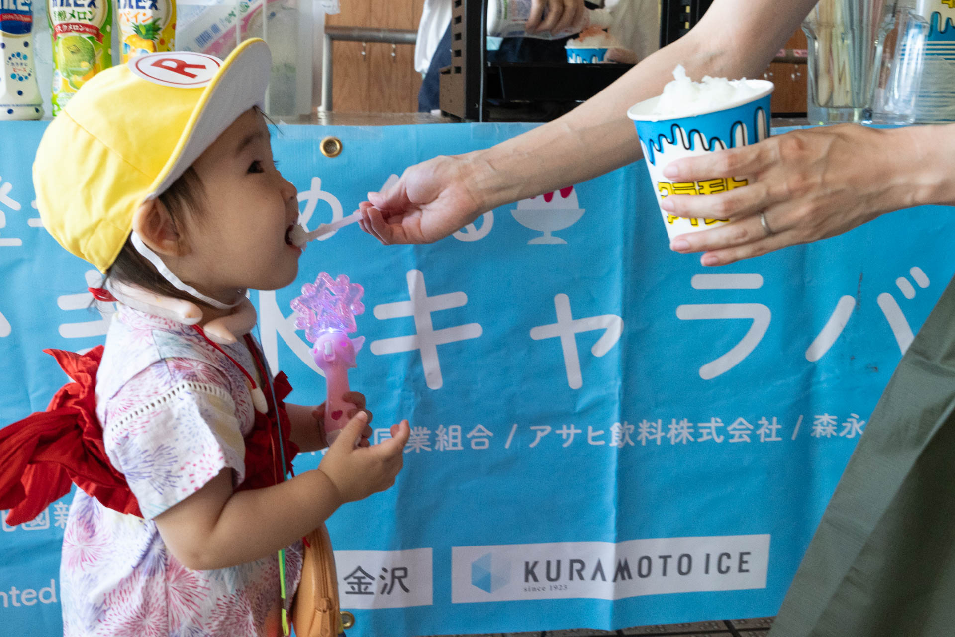 かき氷キャラバンも大忙しで、次々とかき氷を作っていきます。色とりどりに並ぶカルピスのボトルを見て、大人も子どもも「すごい!カルピスってこんなにも色んな味あるんや!」「どれにしようかな…」とワクワクしながら味を選んでくれていました。