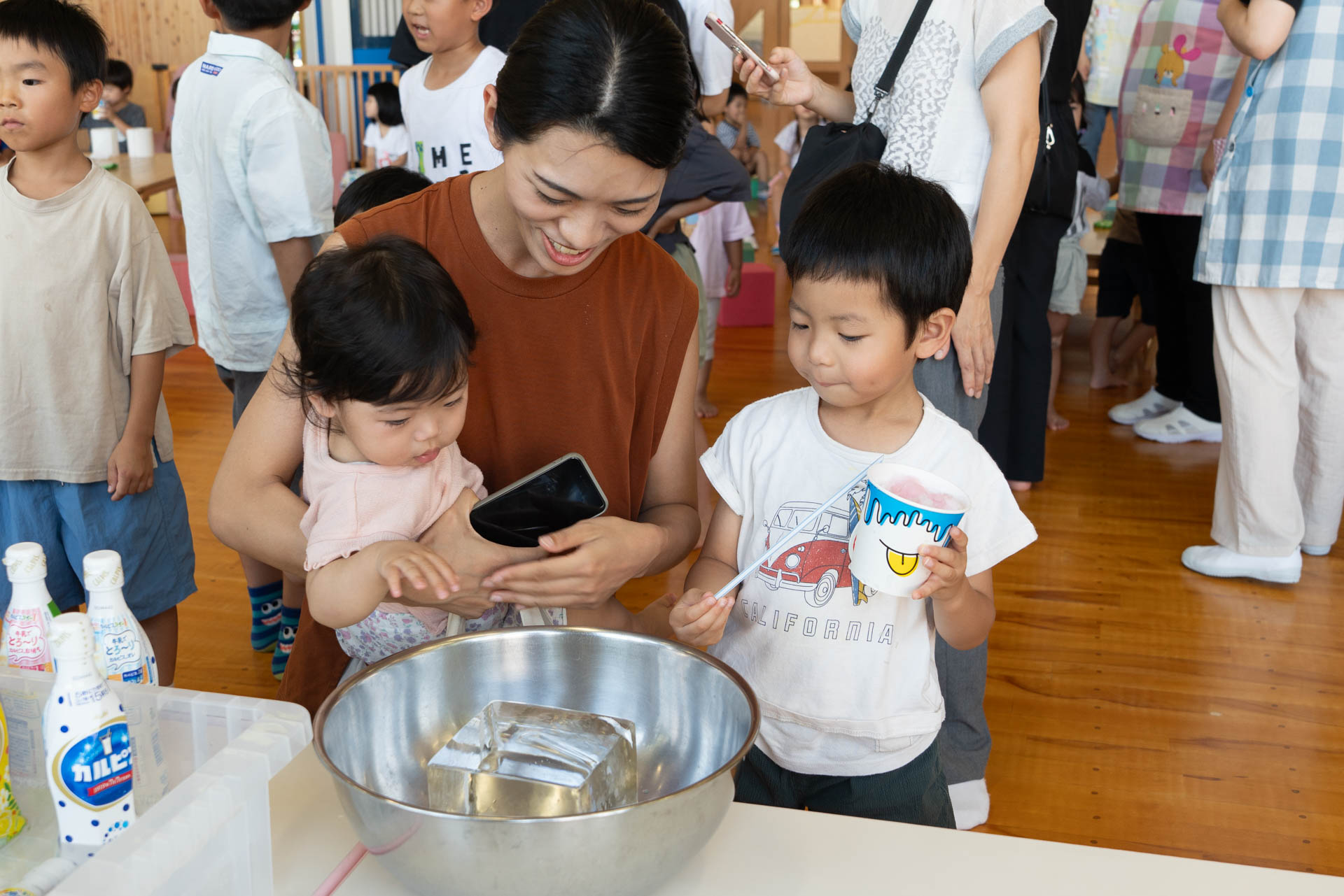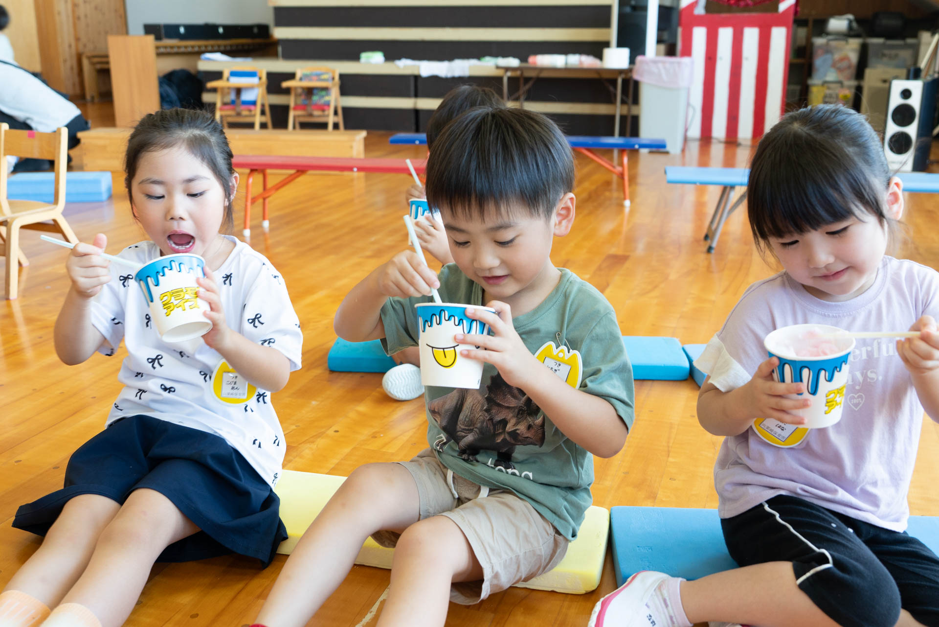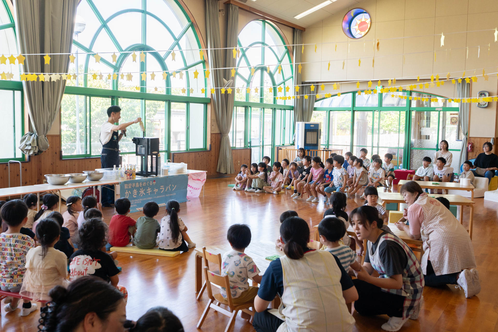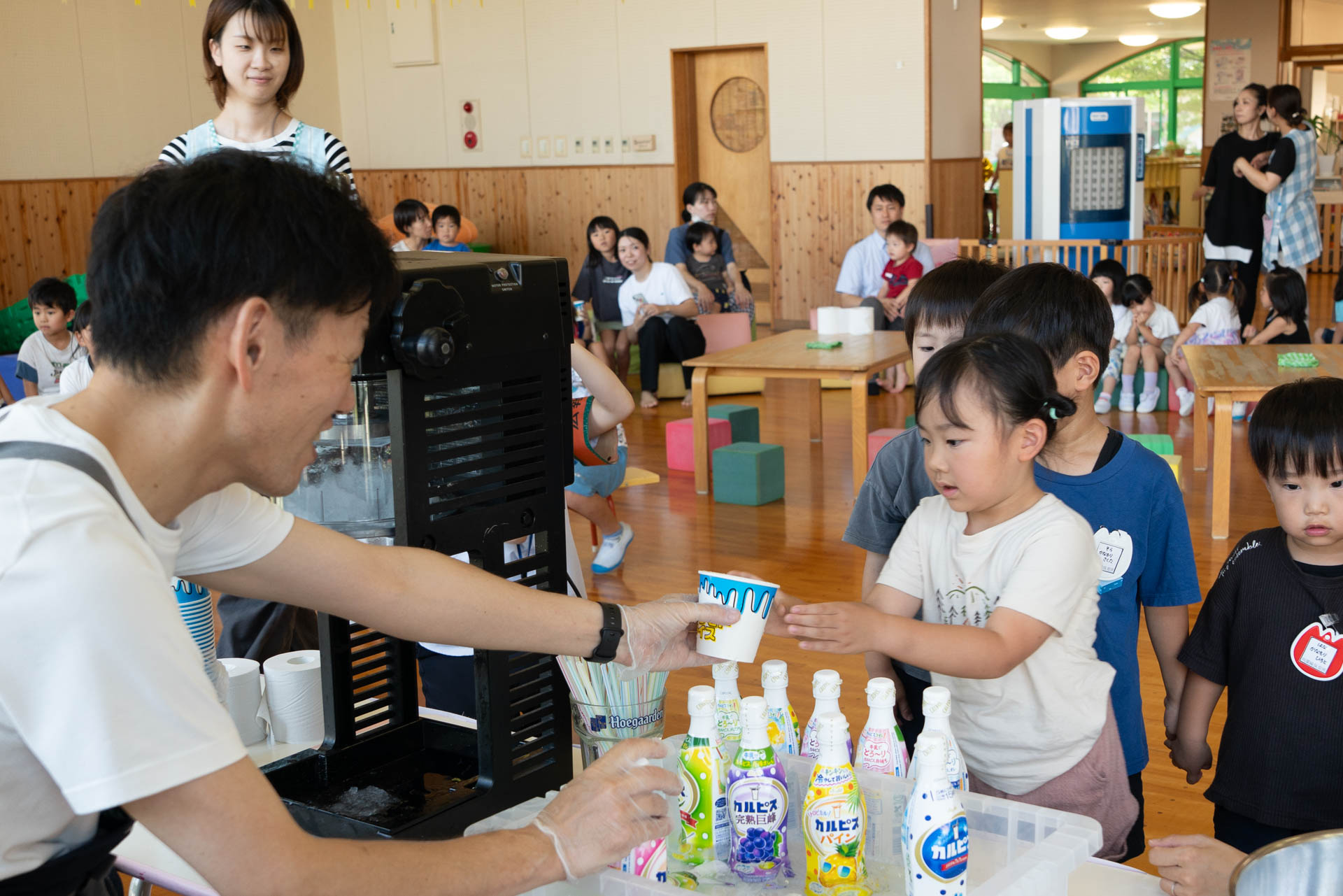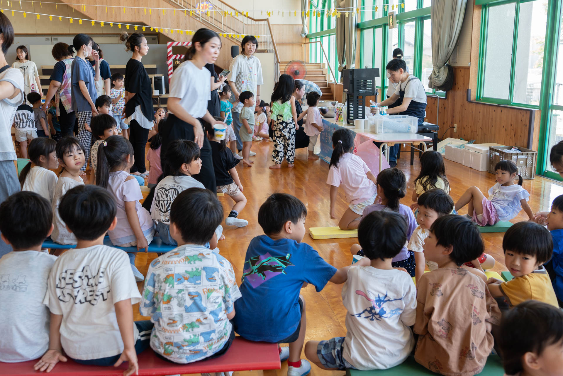園に到着すると、すでに子どもたちがホールで勢揃いしていました。待ちきれなくて、嬉しそうにする子どもたち。「もう待てなーい!」「はやくかき氷たべたーい!」と無邪気な声が聞こえます。